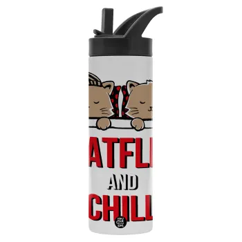 Catflix and Chill, Μεταλλικό παγούρι θερμός με καλαμάκι & χειρολαβή, ανοξείδωτο ατσάλι (Stainless steel 304), διπλού τοιχώματος, 600ml