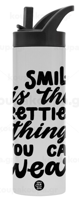 A smile is the prettiest thing you can wear, Μεταλλικό παγούρι θερμός με καλαμάκι & χειρολαβή, ανοξείδωτο ατσάλι (Stainless steel 304), διπλού τοιχώματος, 600ml