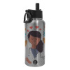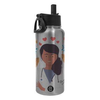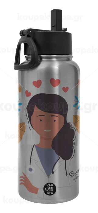 Ευχαριστώ για όλα γιατρέ, Μεταλλικό παγούρι θερμός Silver με καλαμάκι και χερούλι (Stainless steel), διπλού τοιχώματος, 950ml