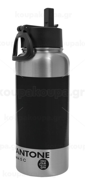 Pantone Black, Μεταλλικό παγούρι θερμός Silver με καλαμάκι και χερούλι (Stainless steel), διπλού τοιχώματος, 950ml