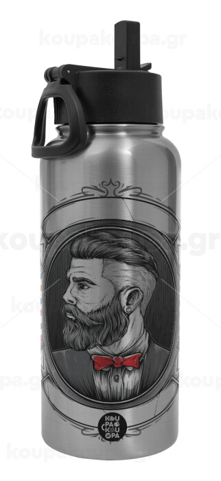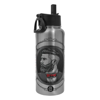 Barber shop, Μεταλλικό παγούρι θερμός Silver με καλαμάκι και χερούλι (Stainless steel), διπλού τοιχώματος, 950ml