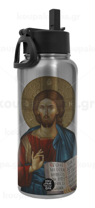 Ιησούς, Μεταλλικό παγούρι θερμός Silver με καλαμάκι και χερούλι (Stainless steel), διπλού τοιχώματος, 950ml