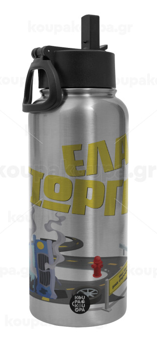 Έλα Γιώργη, πω πω μια στροφάρα, Μεταλλικό παγούρι θερμός Silver με καλαμάκι και χερούλι (Stainless steel), διπλού τοιχώματος, 950ml