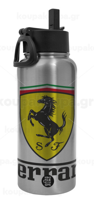 Ferrari S.p.A., Μεταλλικό παγούρι θερμός Silver με καλαμάκι και χερούλι (Stainless steel), διπλού τοιχώματος, 950ml