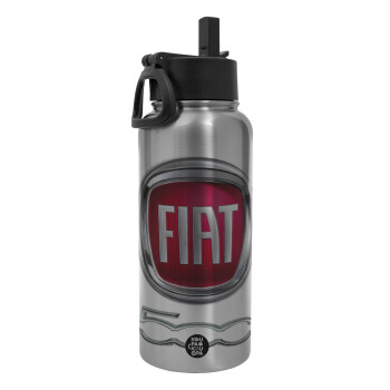 FIAT 500, Μεταλλικό παγούρι θερμός Silver με καλαμάκι και χερούλι (Stainless steel), διπλού τοιχώματος, 950ml