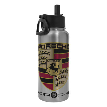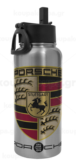 Porsche, Μεταλλικό παγούρι θερμός Silver με καλαμάκι και χερούλι (Stainless steel), διπλού τοιχώματος, 950ml