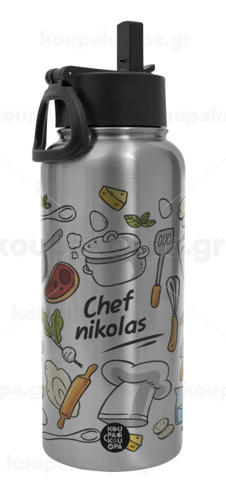 Chef με όνομα, Μεταλλικό παγούρι θερμός Silver με καλαμάκι και χερούλι (Stainless steel), διπλού τοιχώματος, 950ml