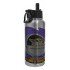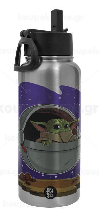 Baby Yoda mandalorian, Μεταλλικό παγούρι θερμός Silver με καλαμάκι και χερούλι (Stainless steel), διπλού τοιχώματος, 950ml
