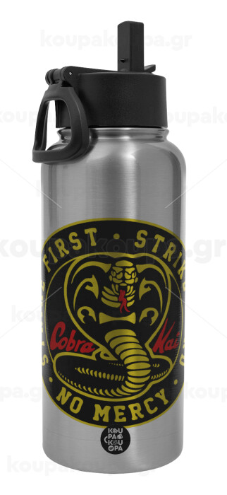 cobra kai strike first dojo, Μεταλλικό παγούρι θερμός Silver με καλαμάκι και χερούλι (Stainless steel), διπλού τοιχώματος, 950ml
