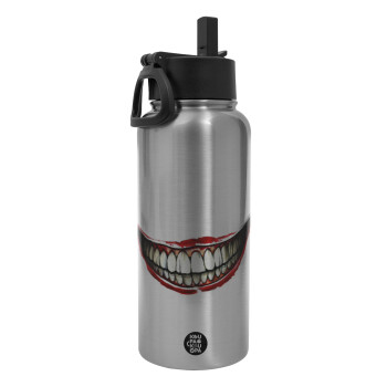 Joker smile, Μεταλλικό παγούρι θερμός Silver με καλαμάκι και χερούλι (Stainless steel), διπλού τοιχώματος, 950ml