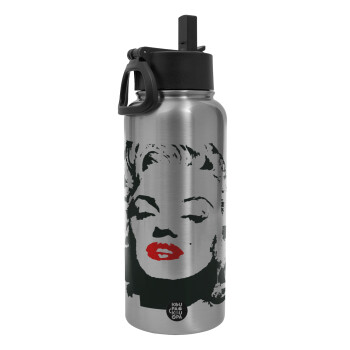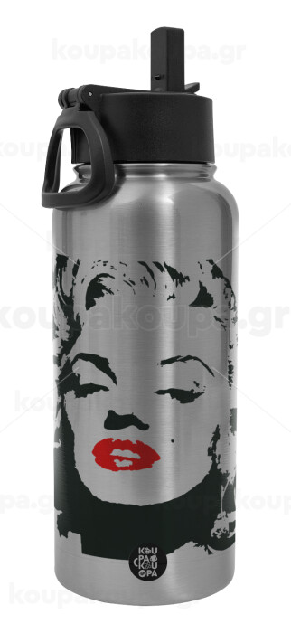 Merilin, Μεταλλικό παγούρι θερμός Silver με καλαμάκι και χερούλι (Stainless steel), διπλού τοιχώματος, 950ml