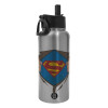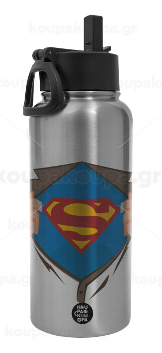 Superman hands, Μεταλλικό παγούρι θερμός Silver με καλαμάκι και χερούλι (Stainless steel), διπλού τοιχώματος, 950ml