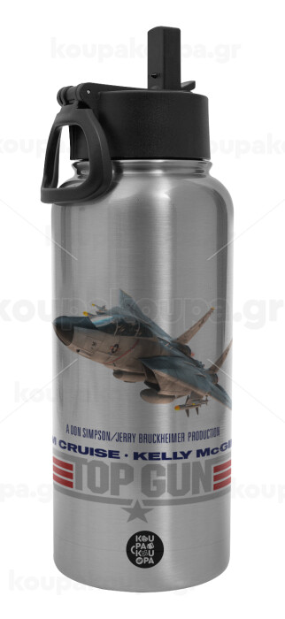 Top Gun, Μεταλλικό παγούρι θερμός Silver με καλαμάκι και χερούλι (Stainless steel), διπλού τοιχώματος, 950ml