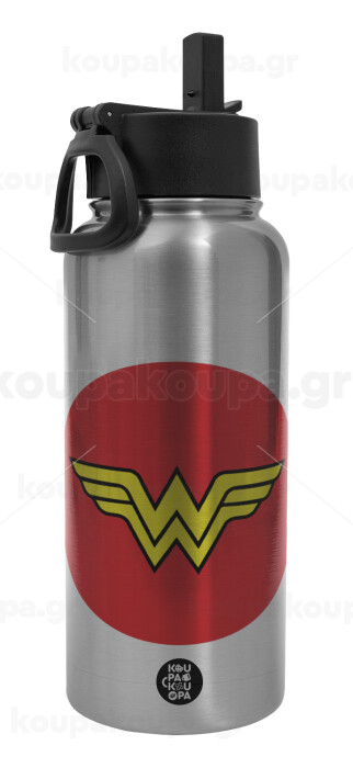 Wonder woman, Μεταλλικό παγούρι θερμός Silver με καλαμάκι και χερούλι (Stainless steel), διπλού τοιχώματος, 950ml