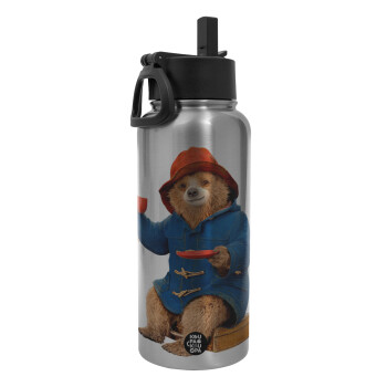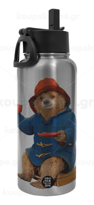 Αρκουδάκι Πάντινγκτον, Μεταλλικό παγούρι θερμός Silver με καλαμάκι και χερούλι (Stainless steel), διπλού τοιχώματος, 950ml