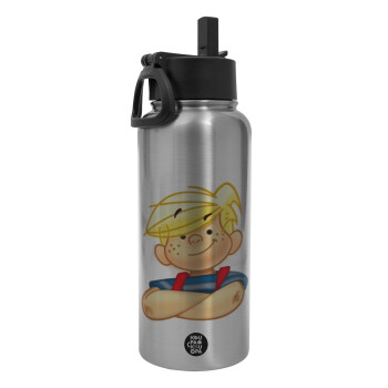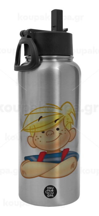 Ντένις ο τρομερός, Μεταλλικό παγούρι θερμός Silver με καλαμάκι και χερούλι (Stainless steel), διπλού τοιχώματος, 950ml