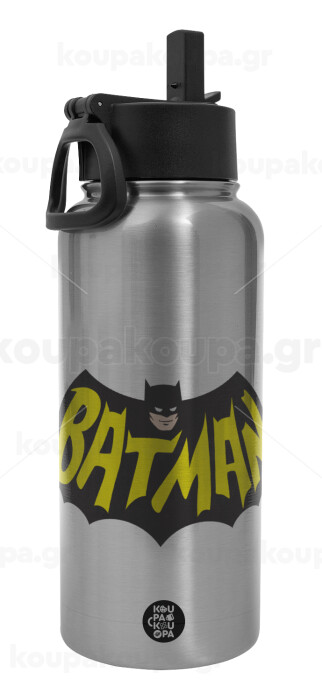 Batman classic logo, Μεταλλικό παγούρι θερμός Silver με καλαμάκι και χερούλι (Stainless steel), διπλού τοιχώματος, 950ml