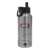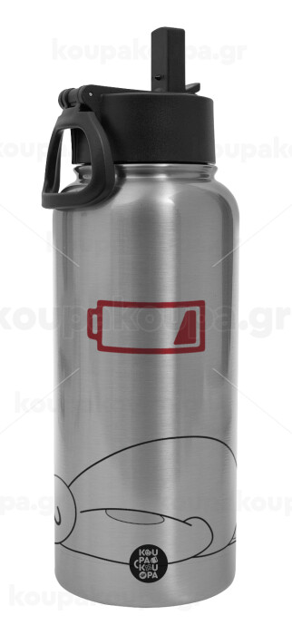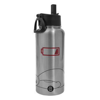 Baymax battery low, Μεταλλικό παγούρι θερμός Silver με καλαμάκι και χερούλι (Stainless steel), διπλού τοιχώματος, 950ml