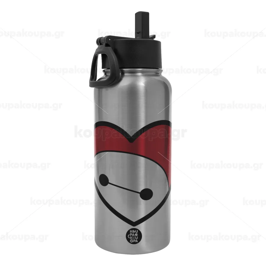Baymax heart, Μεταλλικό παγούρι θερμός Silver με καλαμάκι και χερούλι (Stainless steel), διπλού τοιχώματος, 950ml