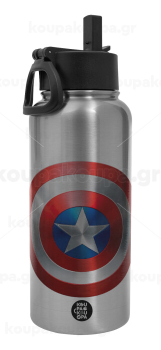 Captain America, Μεταλλικό παγούρι θερμός Silver με καλαμάκι και χερούλι (Stainless steel), διπλού τοιχώματος, 950ml
