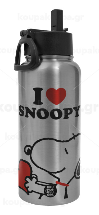 I LOVE SNOOPY, Μεταλλικό παγούρι θερμός Silver με καλαμάκι και χερούλι (Stainless steel), διπλού τοιχώματος, 950ml