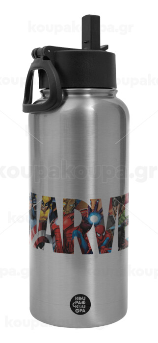 MARVEL characters, Μεταλλικό παγούρι θερμός Silver με καλαμάκι και χερούλι (Stainless steel), διπλού τοιχώματος, 950ml