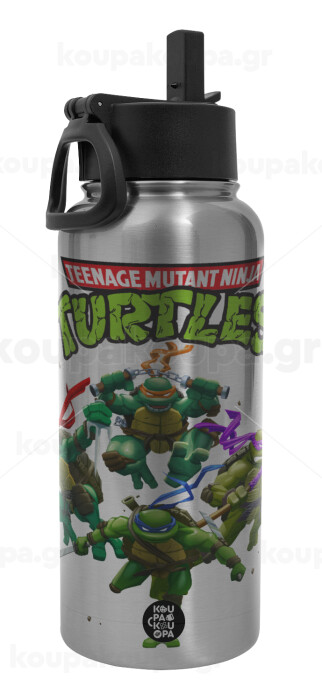 Ninja turtles, Μεταλλικό παγούρι θερμός Silver με καλαμάκι και χερούλι (Stainless steel), διπλού τοιχώματος, 950ml