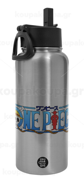 Onepiece logo, Μεταλλικό παγούρι θερμός Silver με καλαμάκι και χερούλι (Stainless steel), διπλού τοιχώματος, 950ml