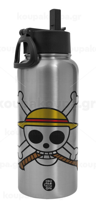 Onepiece skull, Μεταλλικό παγούρι θερμός Silver με καλαμάκι και χερούλι (Stainless steel), διπλού τοιχώματος, 950ml