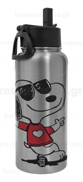 Snoopy καρδούλα, Μεταλλικό παγούρι θερμός Silver με καλαμάκι και χερούλι (Stainless steel), διπλού τοιχώματος, 950ml