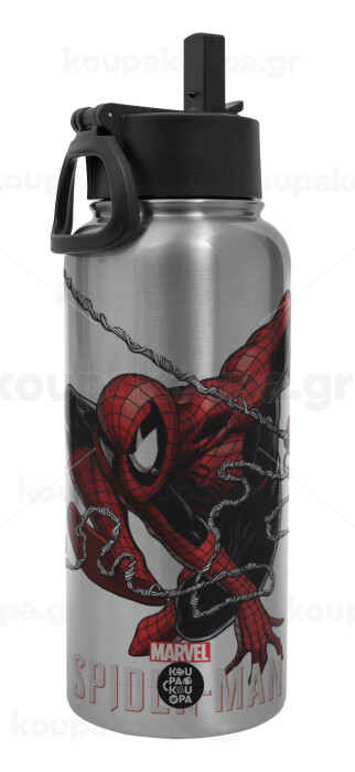 Spider-man, Μεταλλικό παγούρι θερμός Silver με καλαμάκι και χερούλι (Stainless steel), διπλού τοιχώματος, 950ml