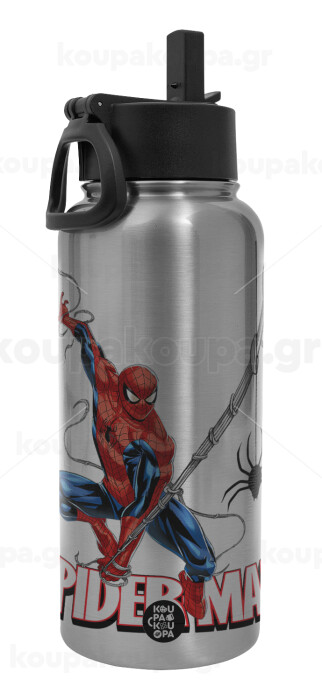 Spiderman fly, Μεταλλικό παγούρι θερμός Silver με καλαμάκι και χερούλι (Stainless steel), διπλού τοιχώματος, 950ml