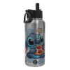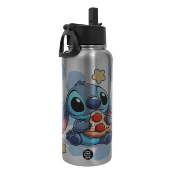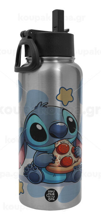 Stitch Pizza, Μεταλλικό παγούρι θερμός Silver με καλαμάκι και χερούλι (Stainless steel), διπλού τοιχώματος, 950ml