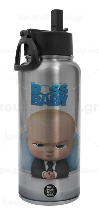 The boss baby, Μεταλλικό παγούρι θερμός Silver με καλαμάκι και χερούλι (Stainless steel), διπλού τοιχώματος, 950ml