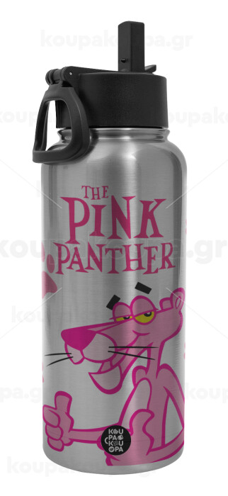 The pink panther, Μεταλλικό παγούρι θερμός Silver με καλαμάκι και χερούλι (Stainless steel), διπλού τοιχώματος, 950ml