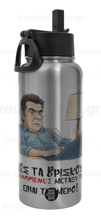 ΠΩΣ ΤΑ ΒΡΙΣΚΟΥΝ ΟΙ ΒΛΑ....ΝΟΙ ΜΕΤΑΞΥ ΤΟΥΣ, ΕΙΝΑΙ ΤΡΟΜΕΡΟ!!!, Μεταλλικό παγούρι θερμός Silver με καλαμάκι και χερούλι (Stainless steel), διπλού τοιχώματος, 950ml