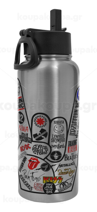 Best Rock Bands hand, Μεταλλικό παγούρι θερμός Silver με καλαμάκι και χερούλι (Stainless steel), διπλού τοιχώματος, 950ml