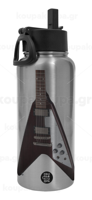 Guitar flying V, Μεταλλικό παγούρι θερμός Silver με καλαμάκι και χερούλι (Stainless steel), διπλού τοιχώματος, 950ml