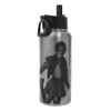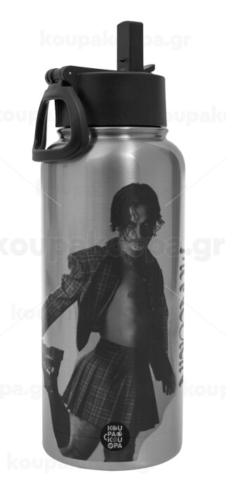Maneskin Damiano David, Μεταλλικό παγούρι θερμός Silver με καλαμάκι και χερούλι (Stainless steel), διπλού τοιχώματος, 950ml