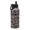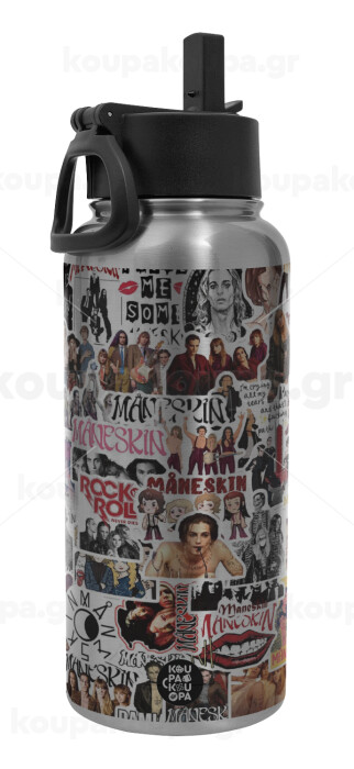 Maneskin stickers, Μεταλλικό παγούρι θερμός Silver με καλαμάκι και χερούλι (Stainless steel), διπλού τοιχώματος, 950ml
