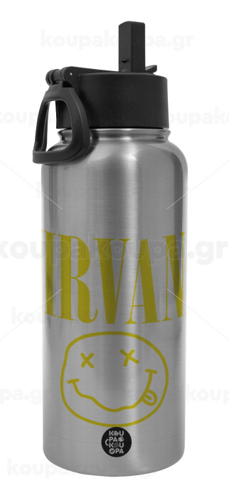 Nirvana, Μεταλλικό παγούρι θερμός Silver με καλαμάκι και χερούλι (Stainless steel), διπλού τοιχώματος, 950ml