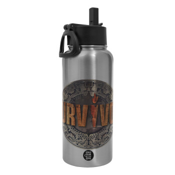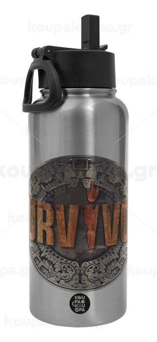 Survivor, Μεταλλικό παγούρι θερμός Silver με καλαμάκι και χερούλι (Stainless steel), διπλού τοιχώματος, 950ml