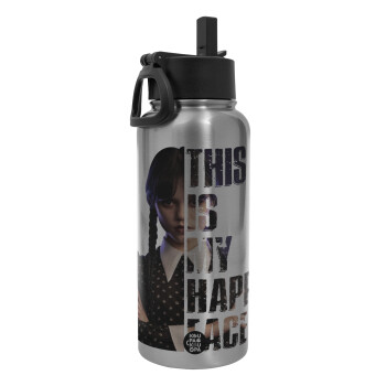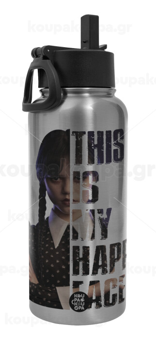 Wednesday, This is my happy face, Μεταλλικό παγούρι θερμός Silver με καλαμάκι και χερούλι (Stainless steel), διπλού τοιχώματος, 950ml