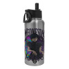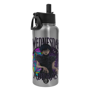 Wednesday Jenna Ortega, Μεταλλικό παγούρι θερμός Silver με καλαμάκι και χερούλι (Stainless steel), διπλού τοιχώματος, 950ml
