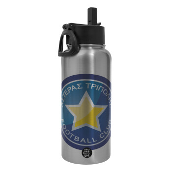 Αστέρας Τρίπολης, Μεταλλικό παγούρι θερμός Silver με καλαμάκι και χερούλι (Stainless steel), διπλού τοιχώματος, 950ml