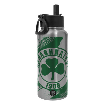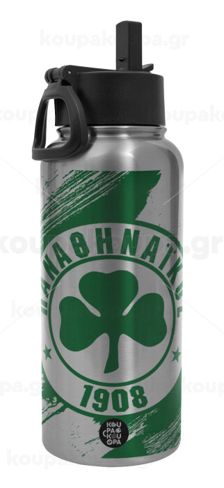 Π.Α.Ο., Μεταλλικό παγούρι θερμός Silver με καλαμάκι και χερούλι (Stainless steel), διπλού τοιχώματος, 950ml