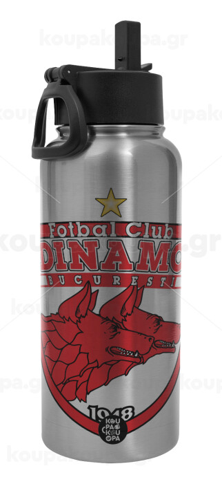 FC Dinamo Bucuresti, Μεταλλικό παγούρι θερμός Silver με καλαμάκι και χερούλι (Stainless steel), διπλού τοιχώματος, 950ml