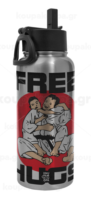 JUDO free hugs, Μεταλλικό παγούρι θερμός Silver με καλαμάκι και χερούλι (Stainless steel), διπλού τοιχώματος, 950ml
