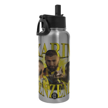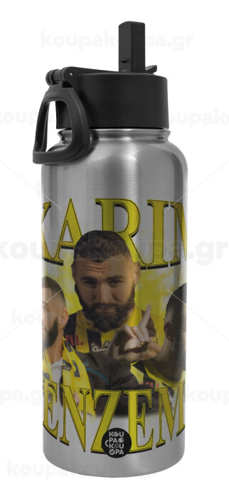 Karim Benzema, Μεταλλικό παγούρι θερμός Silver με καλαμάκι και χερούλι (Stainless steel), διπλού τοιχώματος, 950ml