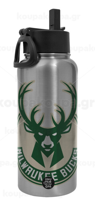 Milwaukee bucks, Μεταλλικό παγούρι θερμός Silver με καλαμάκι και χερούλι (Stainless steel), διπλού τοιχώματος, 950ml